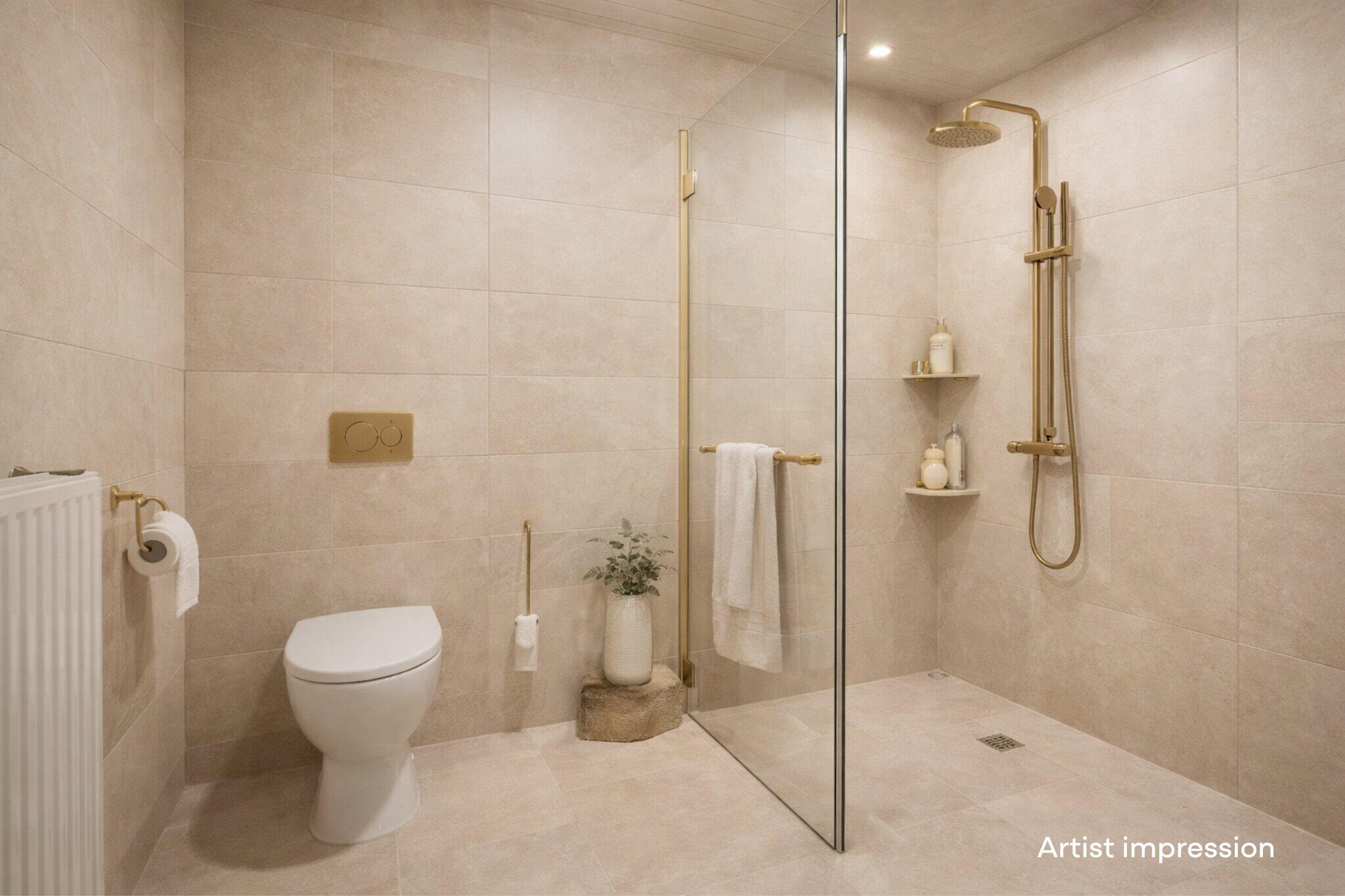- Toilet, wastafel, wastafelmeubel, inloopdouche