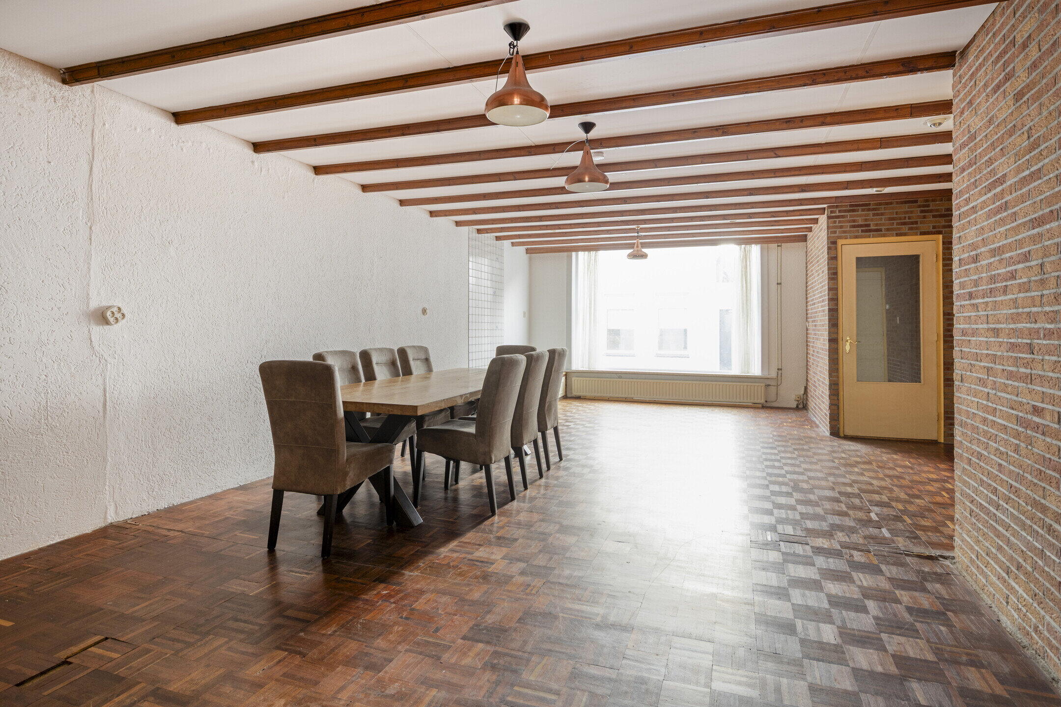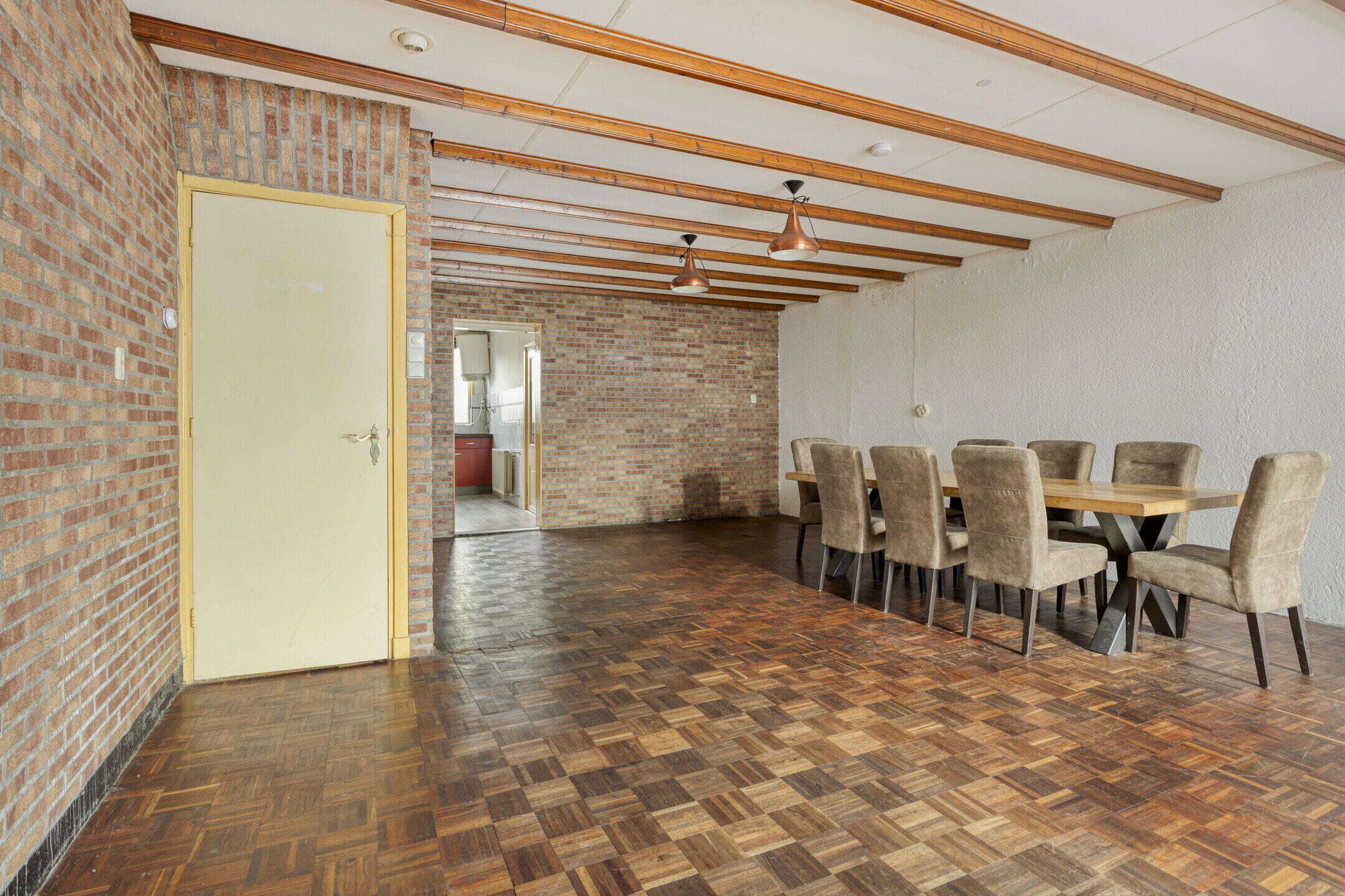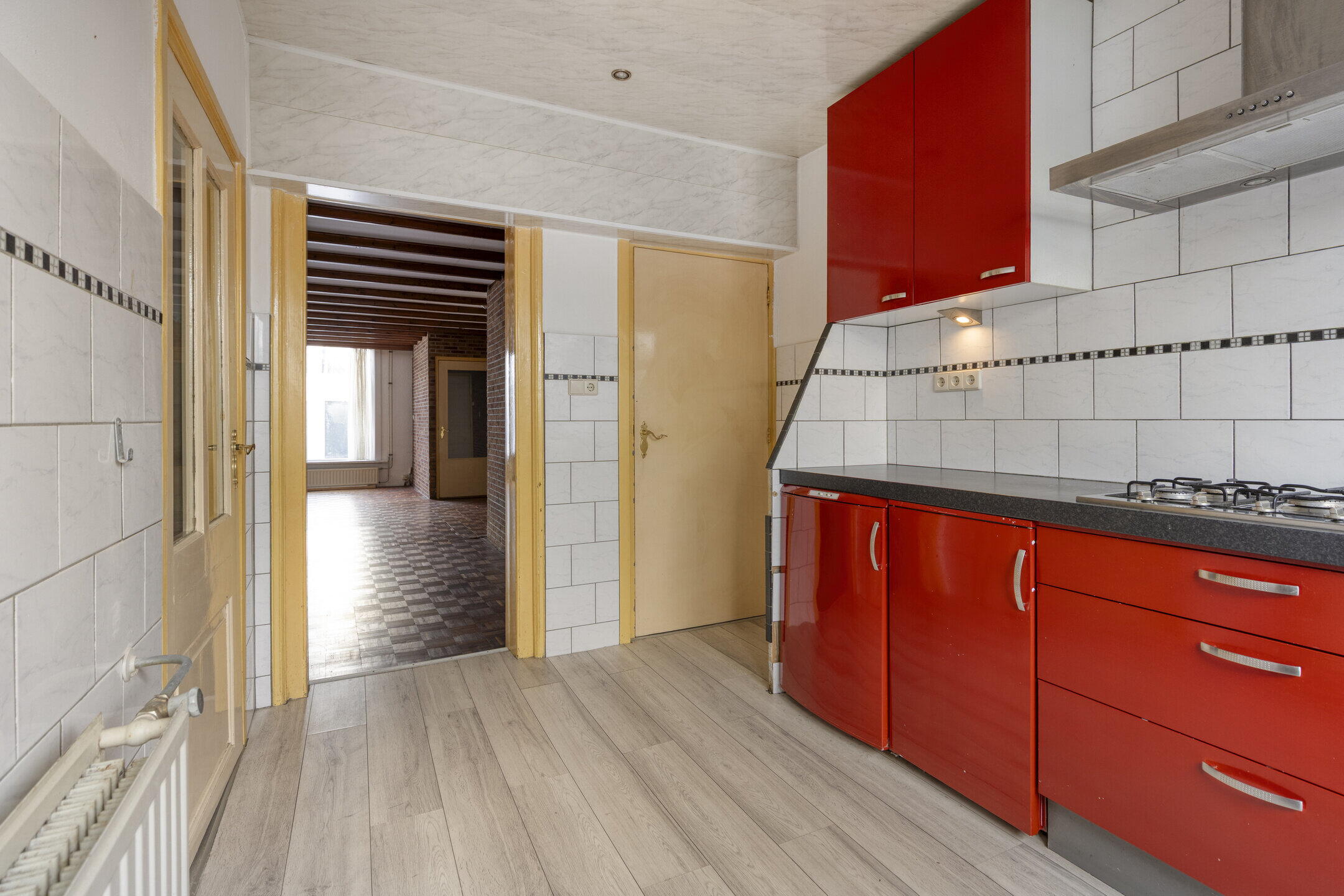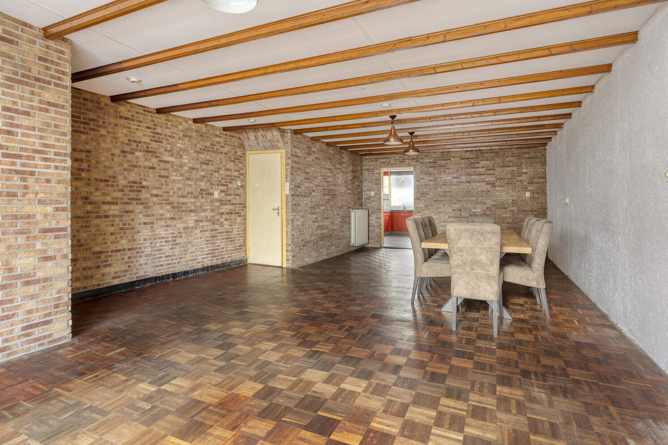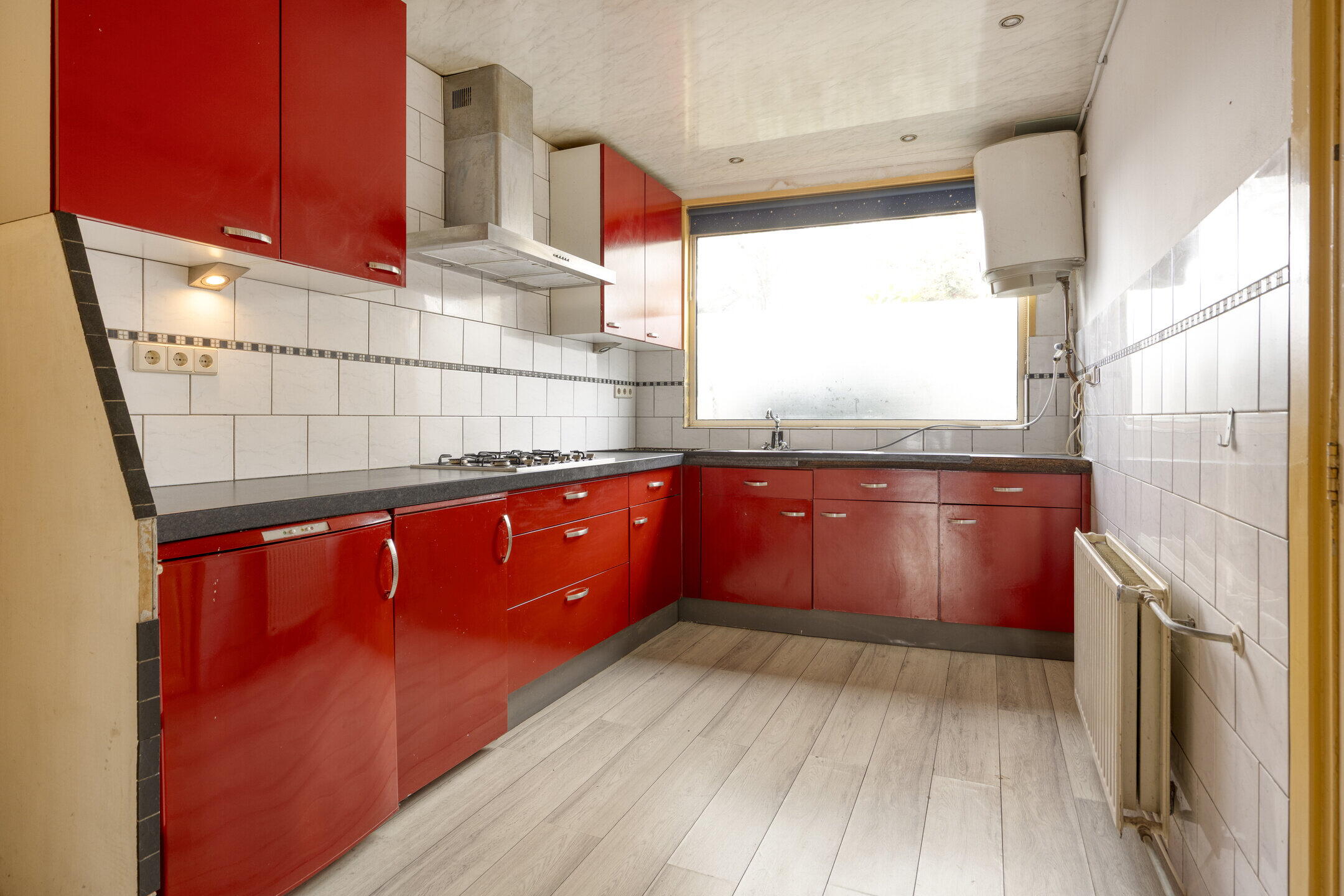 De woonkamer is zonder twijfel één van de grootste pluspunten van deze woning. Wat een ruimte! Dankzij de grote raampartijen geniet je hier van een prettige lichtinval. Er is meer dan genoeg plek voor een royale zithoek én een grote eettafel waar je heerlijk kunt tafelen met familie en vrienden. De woning kan een opknapbeurt gebruiken, maar juist dat biedt kansen. De basis is ruim en solide — hier creëer je met relatief eenvoudige aanpassingen een fantastische leefruimte. De keuken bevindt zich in een aparte ruimte en is netjes. Ook hier geldt: moderniseren is mogelijk, maar de ruimte en indeling bieden volop mogelijkheden om hier een heerlijke kookplek van te maken.